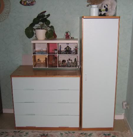 Et voilà enfin une photo des meubles verts, qui cette fois va parfaitement avec le papier peint! (sur la photo, ça fait moyen, mais c'est plus beau en vrai! )